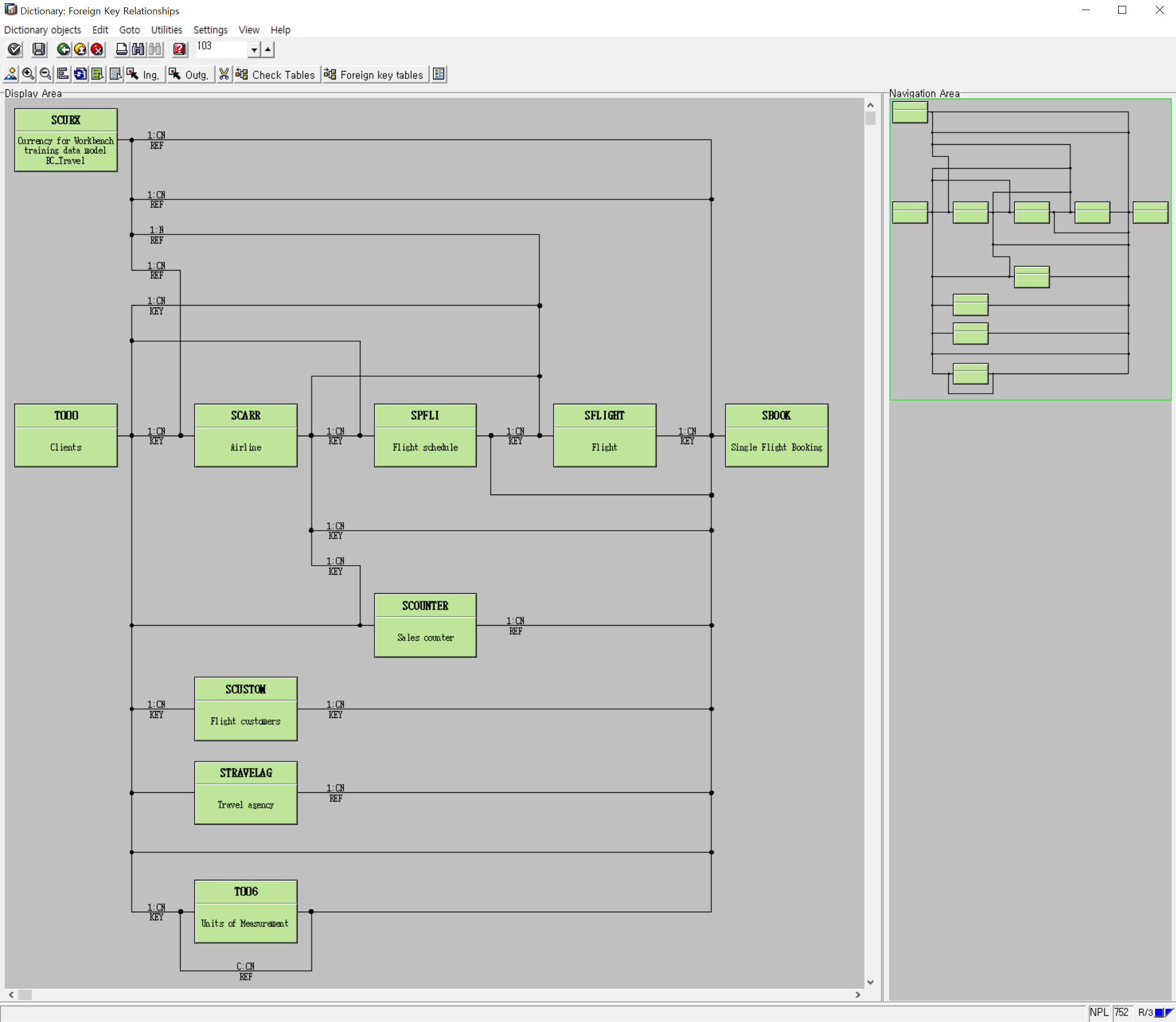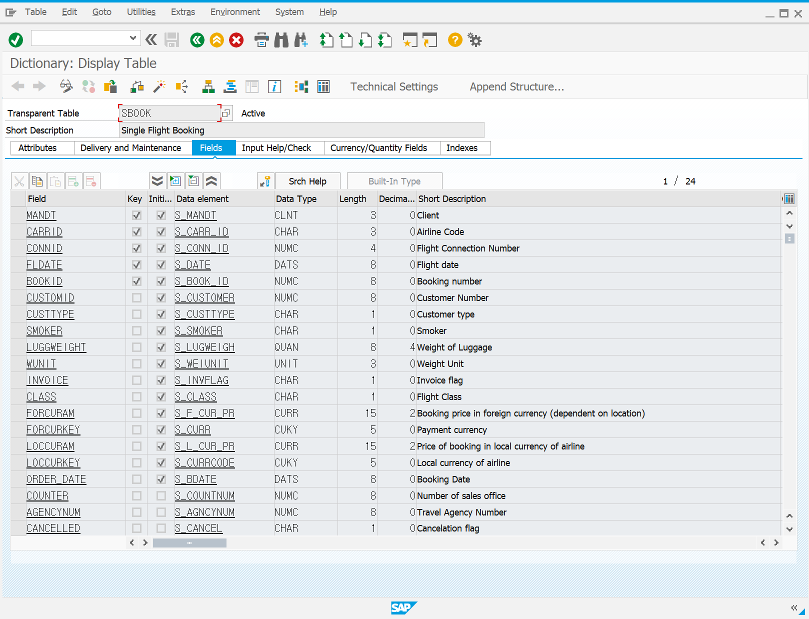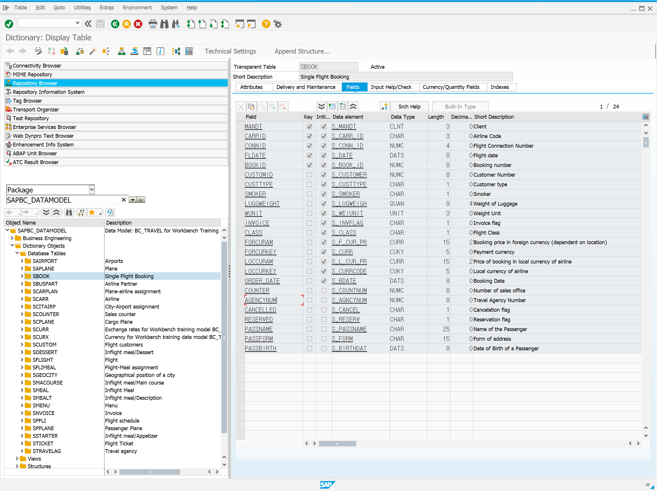 'Graphic' 옆 4번째에 있는 'Display Object List' 버튼을 눌렀을 때의 화면이다. 'Sbook' Table 이 속해있는 Package 'SAPBC_DATAMODEL' 을 확인 할 수 있으며, Package 안에 'Sbook' 과 같은 항공사 시나리오에 사용되고 있는 각종 Table 들을 확인 할 수 있다. 이 Package 는 아까 위에서 설명한 시나리오에 필요한 Object 를 만들어 주는 프로그램이 만들어 준거다. Table 뿐만 아니라 View, Structure 등등 많은 Object 들이 있으니 살펴 보자.