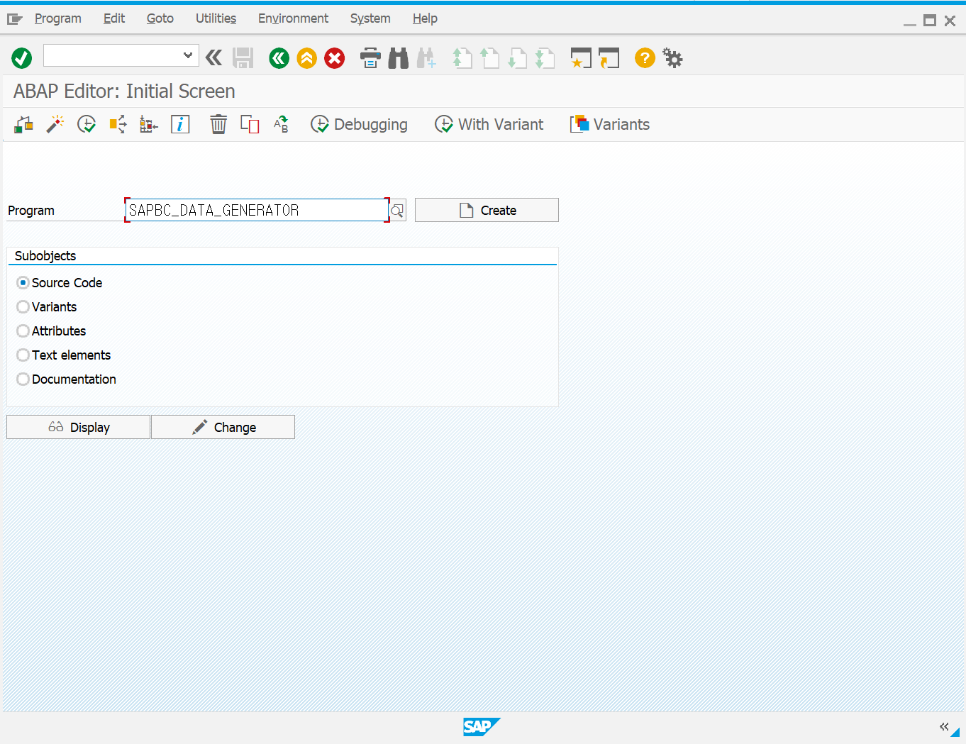 실습에 필요한 서버를 기동 시켜서 SAP 에 로그인 해서 Trasaction 'SE38' 을 입력하자. 그러면 'ABAP Editor' 가 나오는데 프로그램 Source Code 를 불러오는 곳이다. 프로그램 명은 'SAPBC_DATA_GENERATOR' 를 입력하자. 'F7' 을 누르면 Source 를 조회 할 수 있고, 'F8'을 누르면 프로그램이 바로 실행 된다.