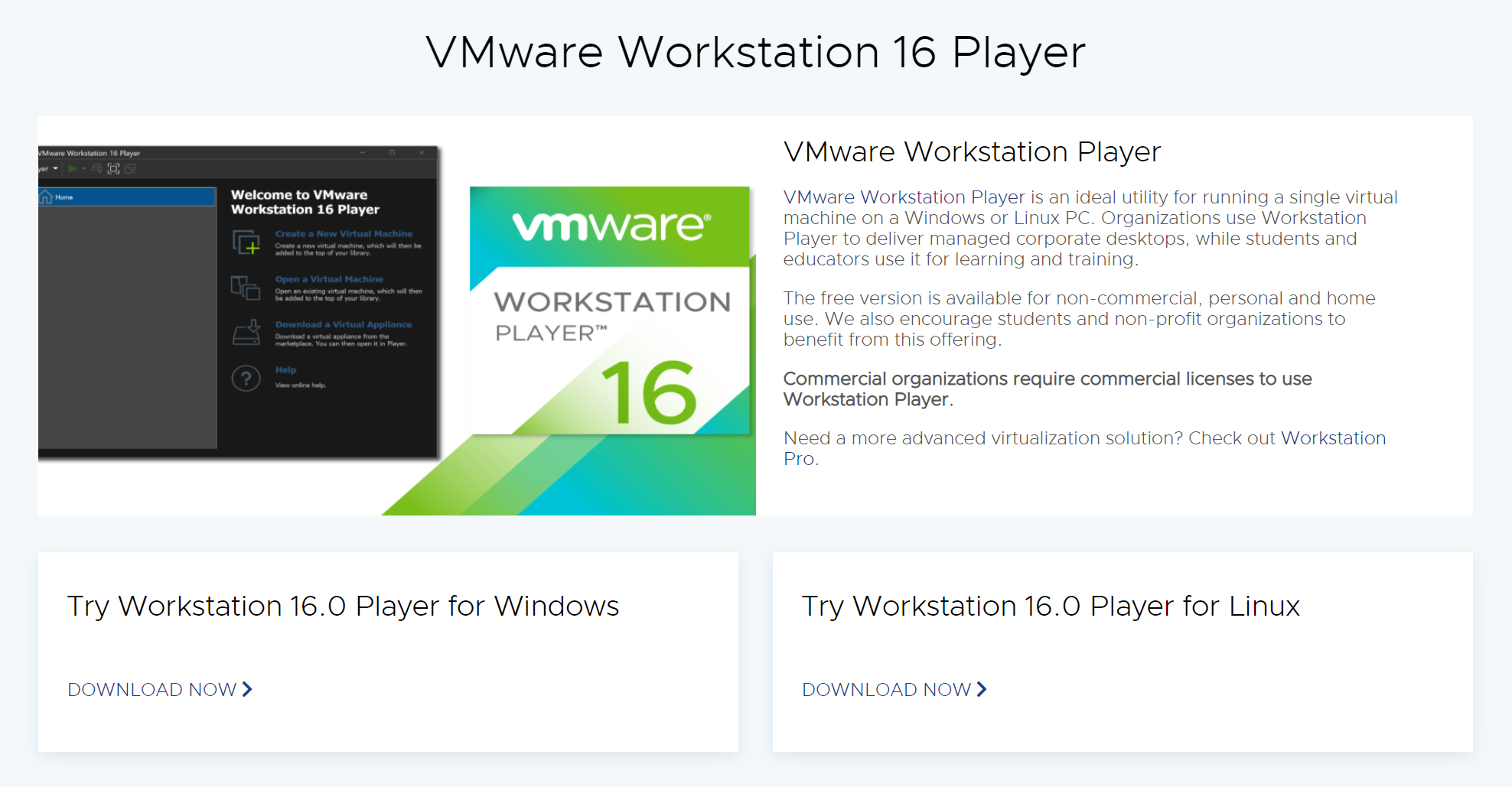 아래 링크로 이동하면 위와 같은 사이틑가 나온다. 왼쪽 아래의 'Try Workstation 16.0 Player for Windows' 밑에 다운로드 버튼을 눌러 소프트웨어를 다운받자. 다른 제품들이 많은데 이 제품만 무료로 이용할 수 있으니 핵갈리지 말자.